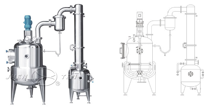 本設備主要包括濃縮罐、冷凝器、汽液分離器、冷卻器、集液器五部件,濃縮罐為夾套結構,冷凝器為列管式,冷卻器為盤管式結構。本設備適用于制藥、食品、化工等行業(yè)對料液的濃縮,并且可作為回收酒精和簡單的回流提取之用。設備與物料接觸部分均采用不銹鋼制造,具有良好的耐腐性,符合GMP標準要求。